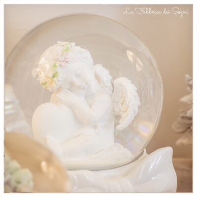 Palla Acqua Neve con Angelo, base in porcellana bianca con fiocco e dettagli platino, Carillon con musica natalizia. Compreso di scatola regalo. Dimensioni: 10 x...